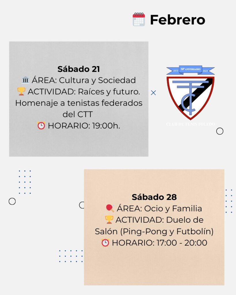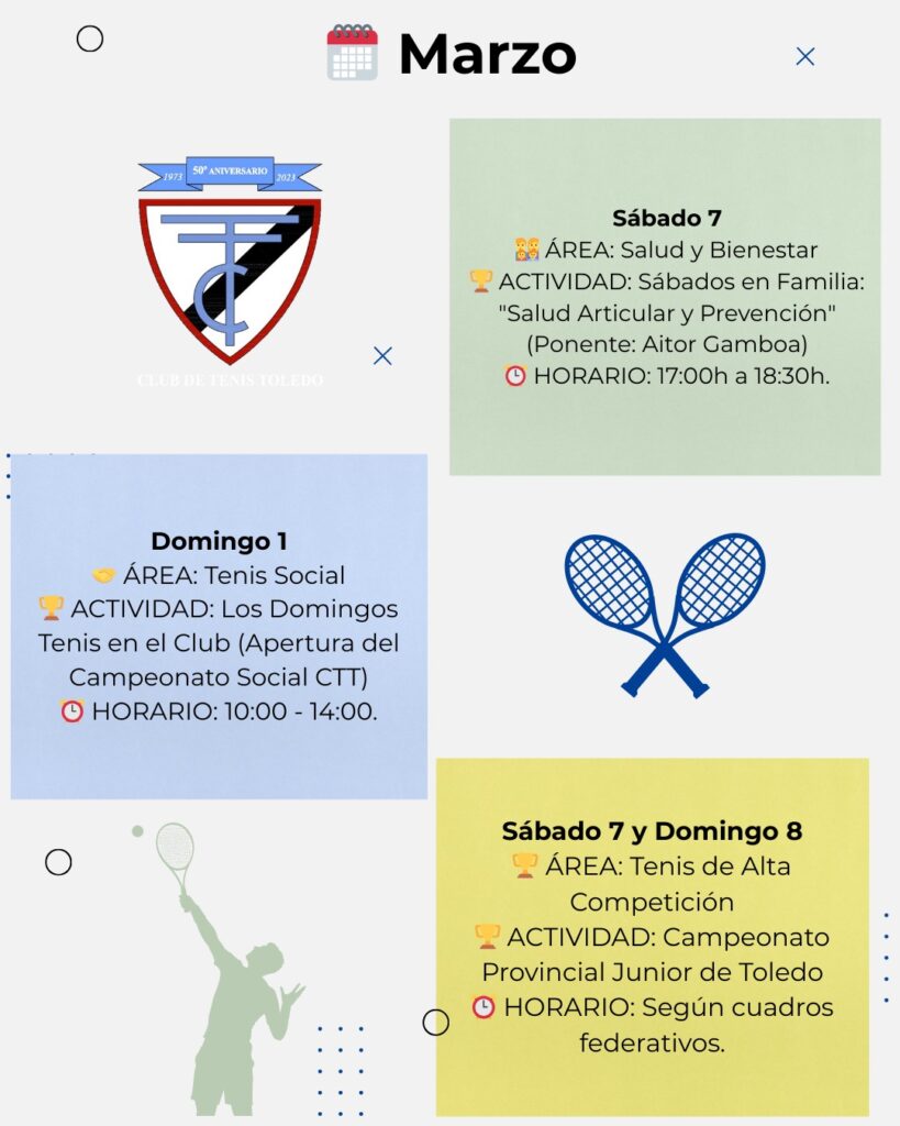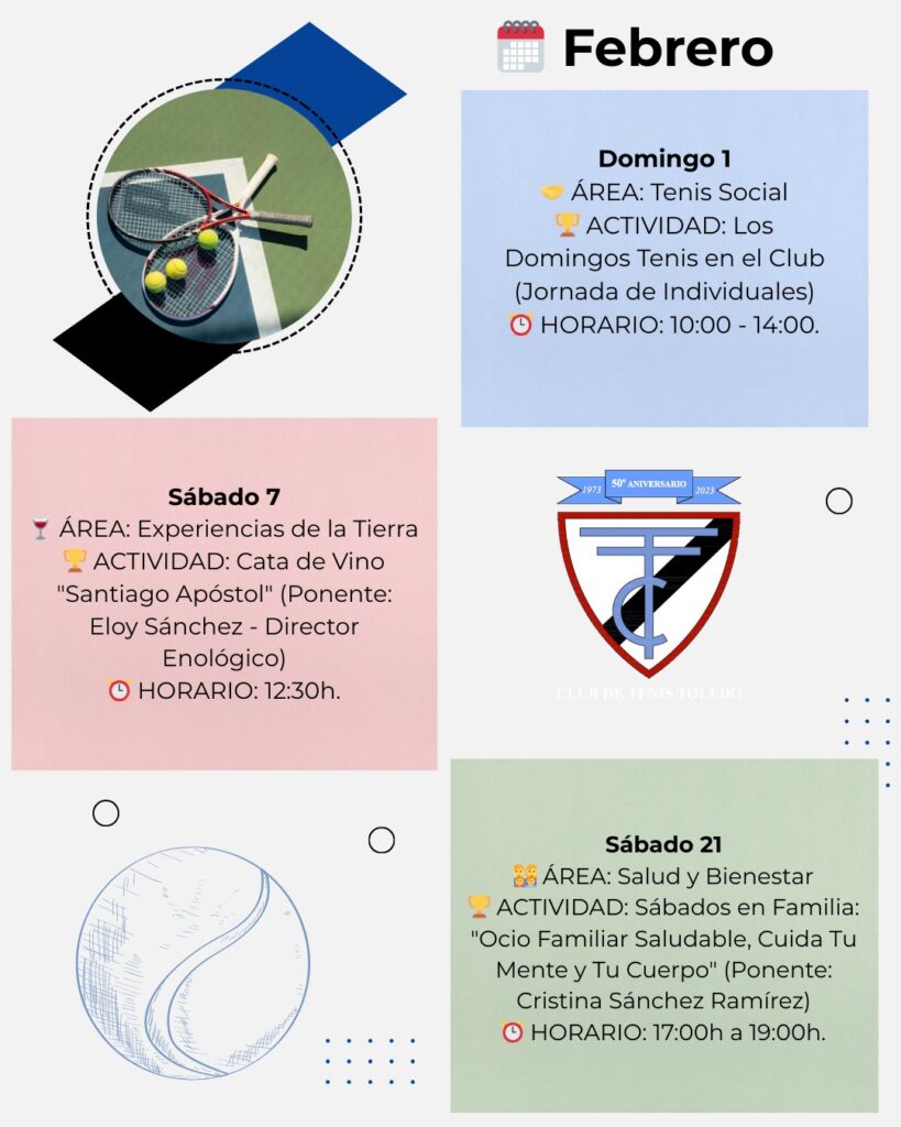De enero a marzo, el club ha acogido y acogerá competiciones oficiales, tenis social, actividades familiares, encuentros culturales y propuestas gastronómicas que consolidan su papel como punto de encuentro en Toledo.